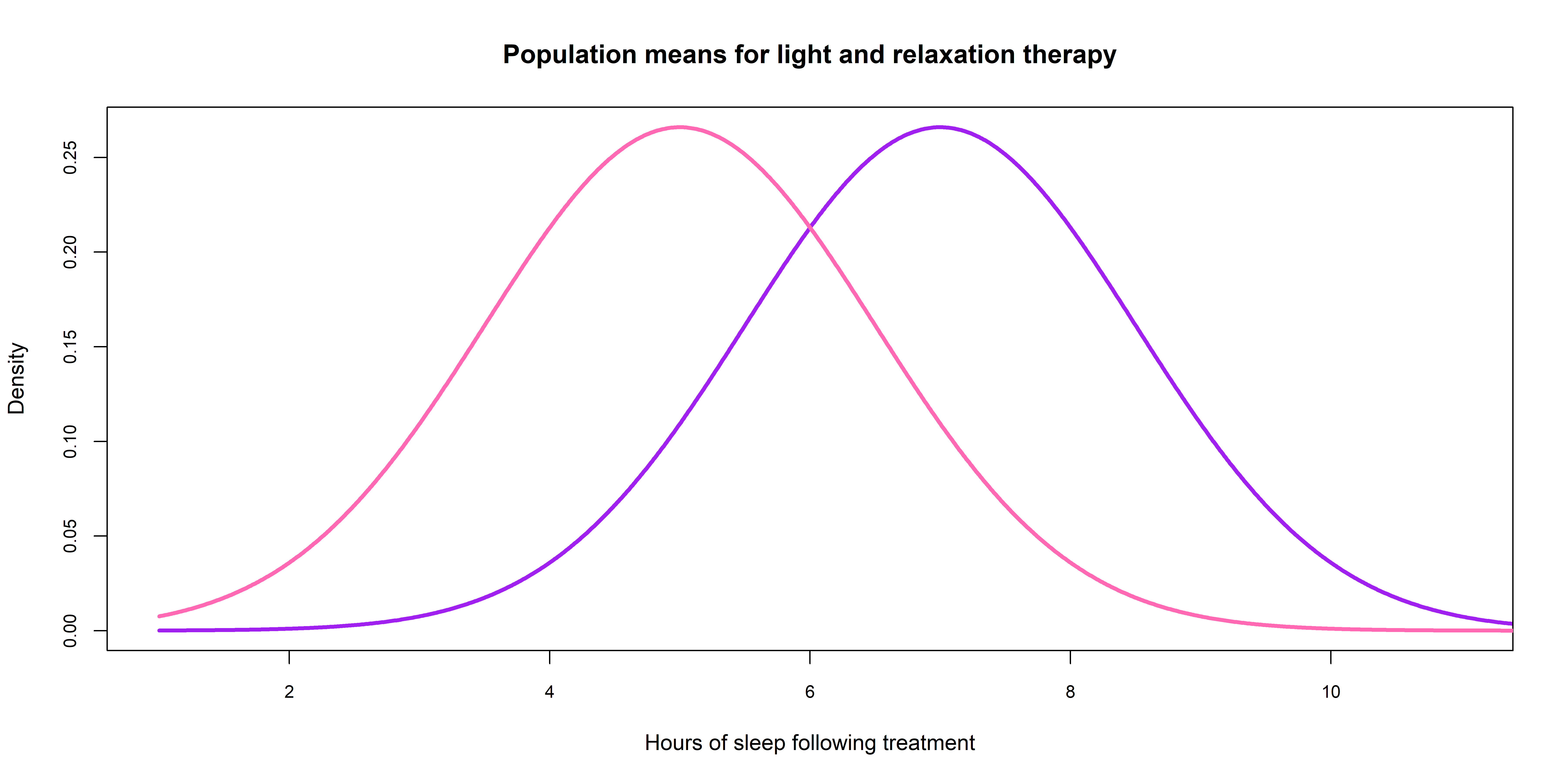See a visual depiction of different population distributions for light and relaxation therapy below. Notice that the distributions appear to have different central tendency (means or medians) but there is still quite a lot of overlap.